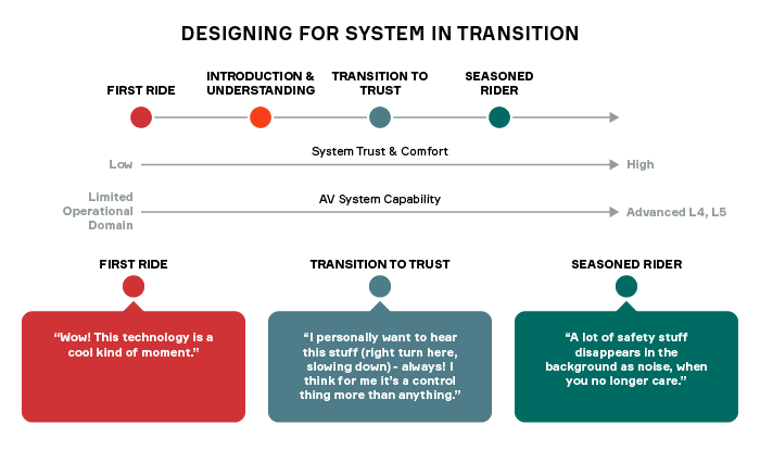 Today, we are very much designing for a system in transition. It starts with consumers gaining first-hand experiences with autonomous vehicles. At roughly 20+ automated rides, they begin to internally adjust and transition their human-robot trust. They gain experiential knowledge of an automated vehicle’s capabilities, limitations, behaviors, and driving style “personality.”