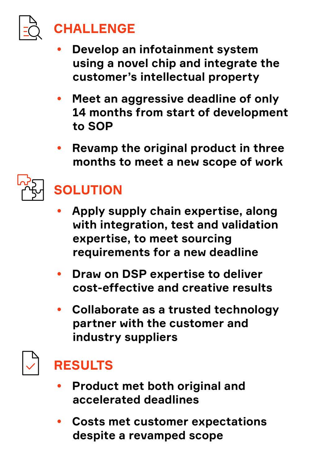 - Develop an infotainment system using a novel chip and integrate the customer’s intellectual property