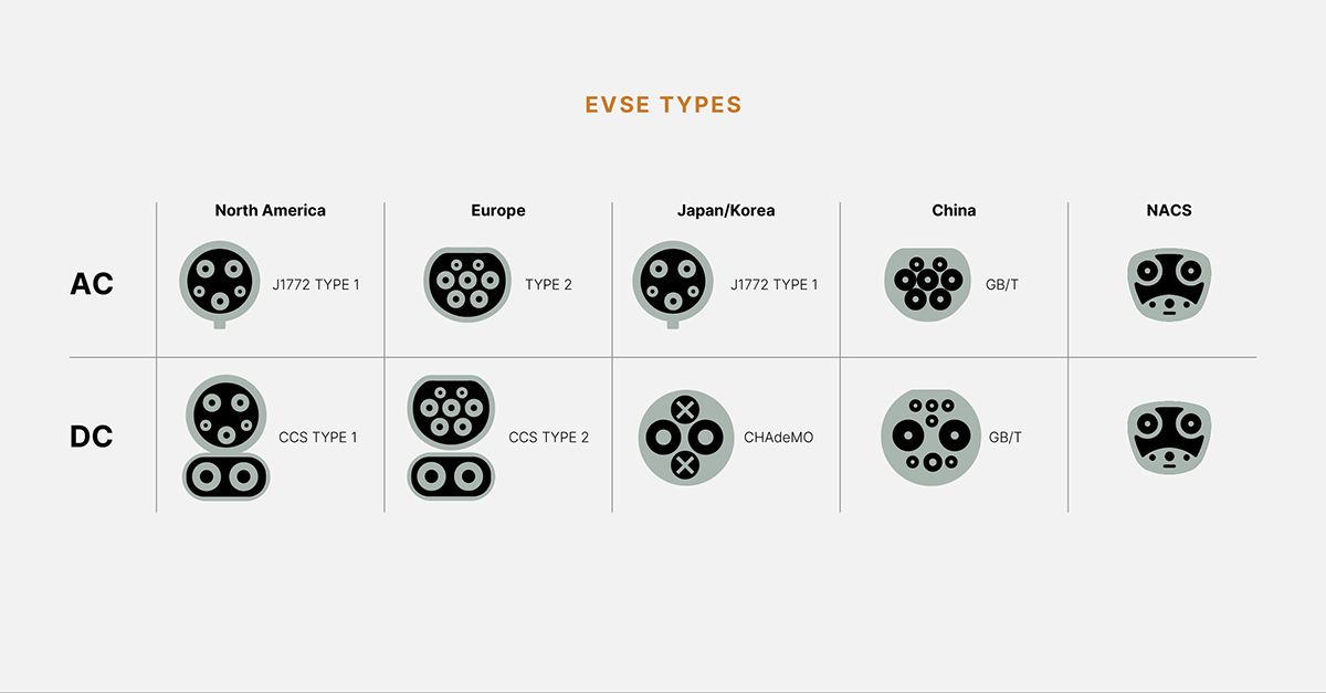 Tipo: el tipo se refiere a la interfaz del vehículo. Desafortunadamente, las organizaciones de estándares no se han alineado detrás de un estándar global. En consecuencia, existen tres interfaces únicas para la carga de CA a nivel mundial (consulte la Figura 3):